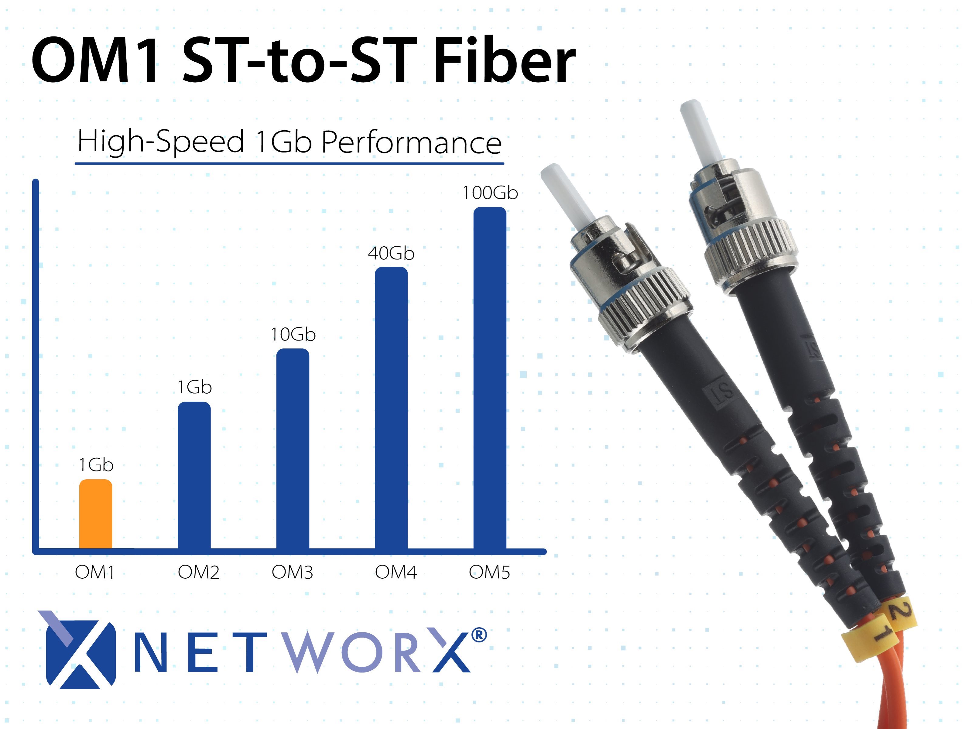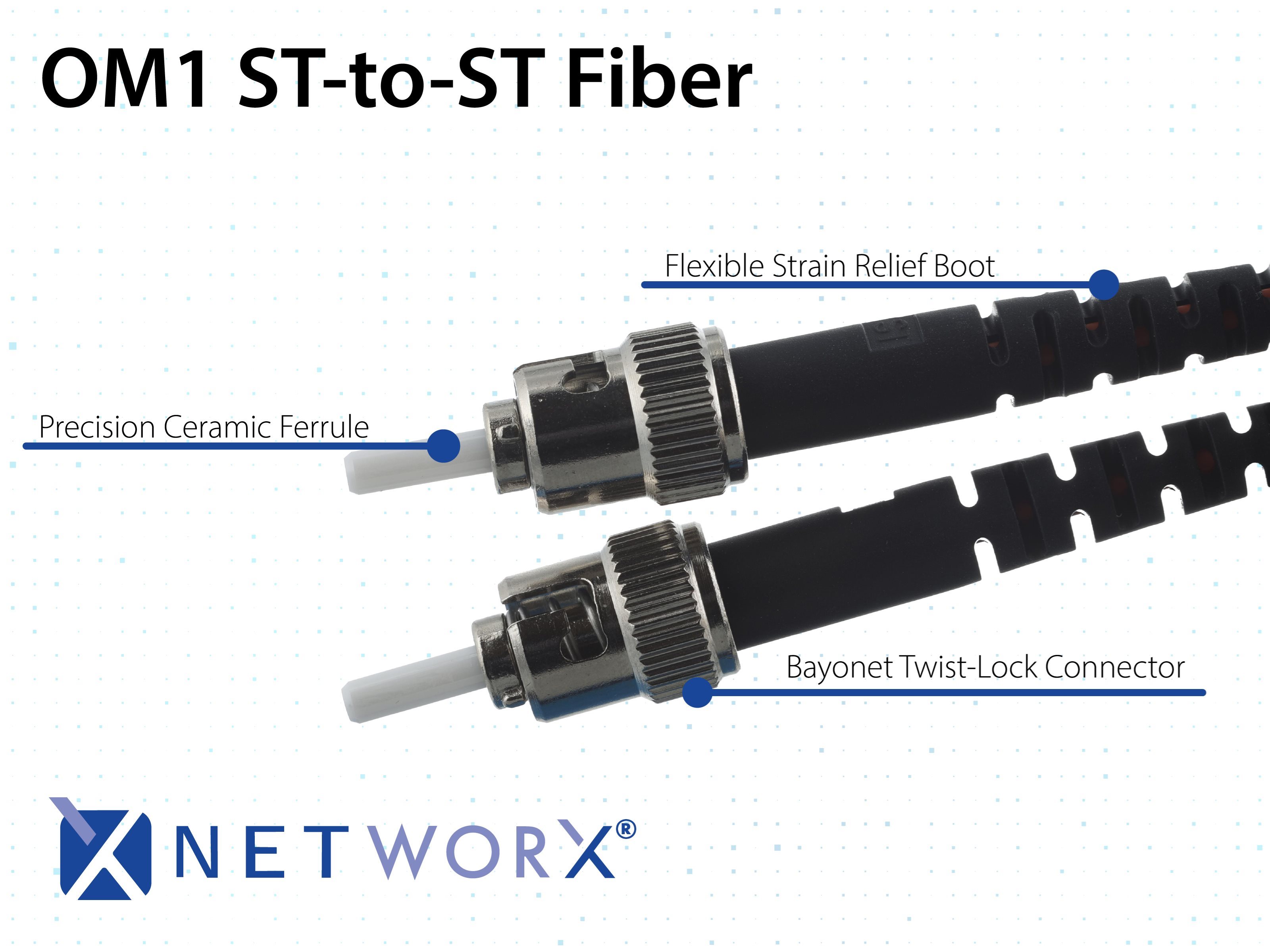 Networx® top quality, 1m Multimode Duplex Fiber Optic Patch Cable (62.5/125) - ST to ST will unleash the power of your Local Area Network. These cables are suitable for the demands of high speed data transmissions that are commonly found in today's Ethernet (10 Mb/s) to Gigabit Ethernet (1 Gb/s) networks. Perfect for audio, video and data transmission applications. Each jumper cable is constructed using Genuine Corning Glass and shipped in individually sealed bags to ensure they arrive in perfect condition. Test results for the individual patch cable will be included in each bag. Color coded connectors assist with identification during the installation process to make installation easy for anyone.