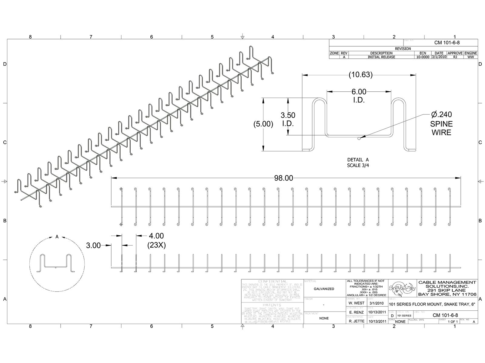 101 Series Snake Tray Cable Tray 6" Wide Floor Tray. Cable Management Solutions' bendable Snake Tray is manufactured from ASTM A510 - High strength steel wire, to form a unique, completely hand bendable cable management system. Welding pre-formed steel hoops to a central 5/16” spin every four inches products Snake Tray, allowing for its unique hand bendable design, while providing easy entry and exit for cable at any point along the length of the tray. The trays are constructed from pre-galvanized wire in accordance with ASTM standards to product a resilient finish, which withstands most indoor applications, or mild sheltered outdoor environments. Snake Tray is products in standard eight foot sections and with its unique high density nesting characteristics allow for more tray to be shipped in less space than our competitors, thus reducing shipping costs and on-site storage requirements.The 101 series Snake Tray is designed for installation below a raised floor and as risers on vertical surfaces. Available in seven sizes, the 101 series can accommodate up to 72 square inches of cable path. The center spine allows the Snake Tray to be easily bent by hand around and over obstructions, around corners and up walls. Mounting rings are pre-formed into the support legs (pre-engineered offsets) and require no additional bracketry. As with all Snake Tray products, only one connector bolt is required to join sections together.