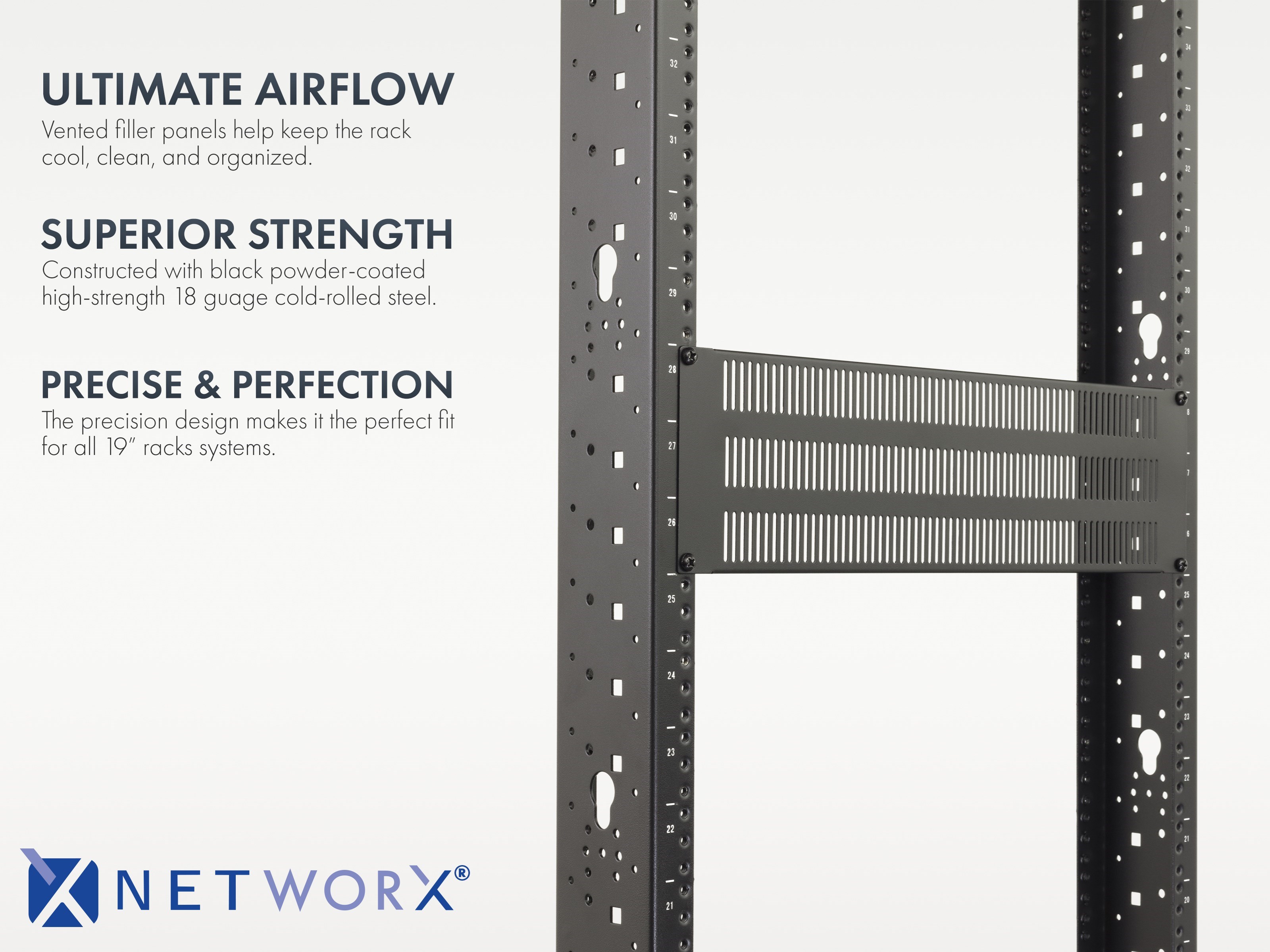 Keep that rack looking profession with this 3U vented filler panel from Networx®. Designed to fill in unsightly gaps while alleviating heat generated by critical networking equipment. Don't wait for equipment failure to act, get a vented filler panel today.