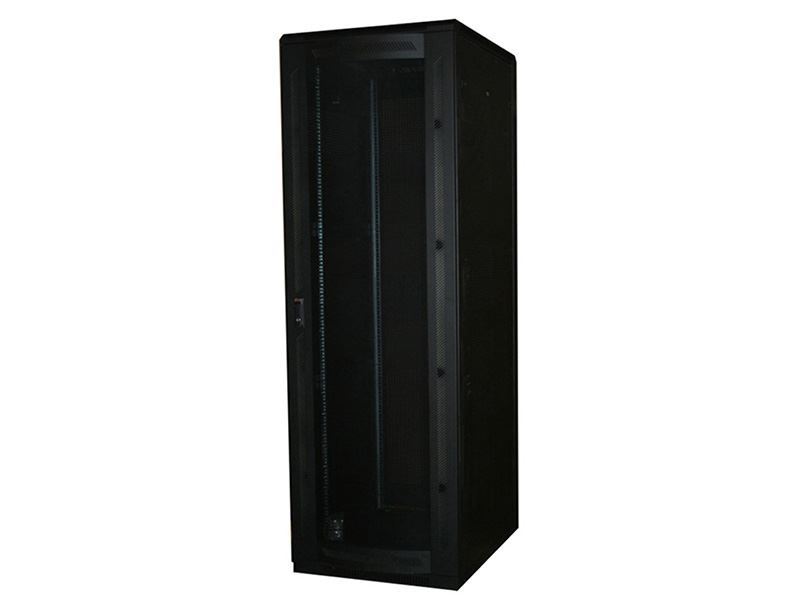Quest 740 Series Floor Enclosures have a 27" wide by 42" depth, are constructed of heavy duty steel, have a reversible vented front door, and split vented rear doors. They come complete with casters, floor levelers as well as two 80 CFM boxer fans for ventilation and air flow. These cabinets are available in two heights, come in a black powdercoat microfinish and are available assembled or unassembled in knockdown boxes.