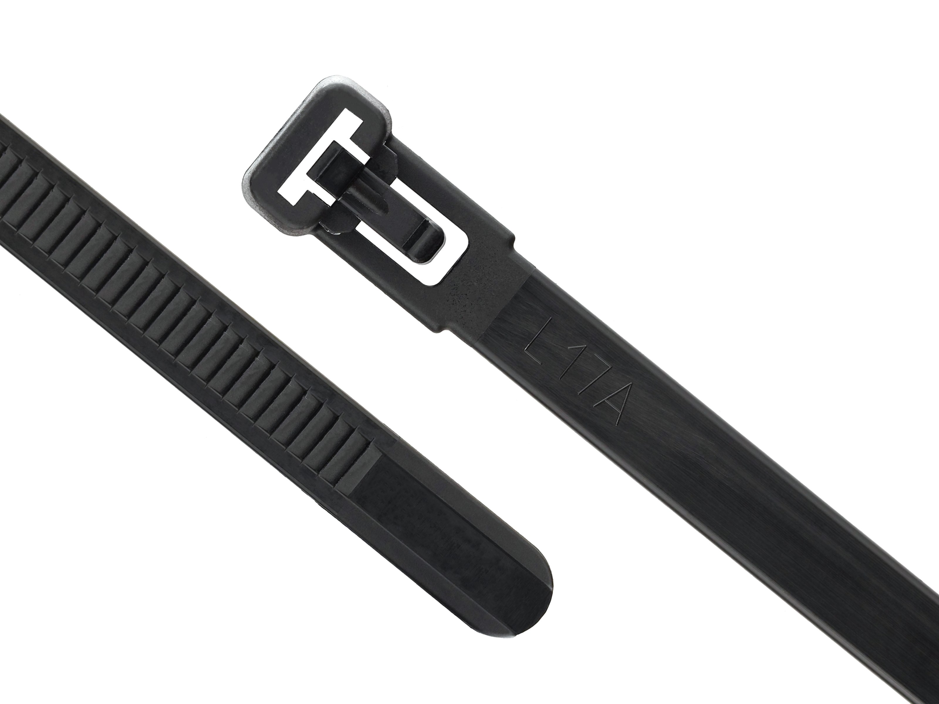 Secure™ black UV releasable nylon cable ties are a natural choice for many applications due to their versatility and ease of installation in addition to their low price point. Nylon Cable Ties have virtually limitless applications for just about every industry. Suitable for most applications, our releasable cable ties have a continuous working temperature of -40°F to 185°F and can support a maximum weight of 50lbs. Available in wide variety of colors allowing virtually limitless options for color coded organization and easy identification. All Secure™ cable ties feature smooth rounded edges making these cable ties easy on the hands, in addition to a finely spaced gear rack allowing for exact adjustment ensuring a snug fit. Comprised of 6/6 Nylon with a compact molecular structure provides better weathering and sunlight resistance, higher melting point, superior colorfastness and excellent abrasion resistance creating a high quality, dependable cable tie with natural high resistance to insects, fungi, animals, molds, mildew, rot and many chemicals.