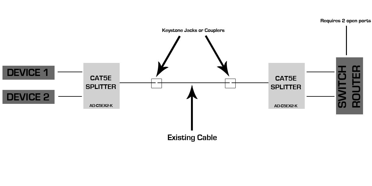 - Actively splits a single cable into two usable connections